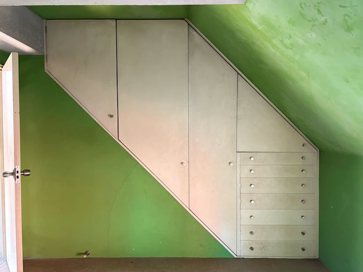 階段を上がると、「緑の部屋」と呼ばれる鮮やかな緑色で塗られた2つの空間につながる。ここは子供部屋などに使われていた。壁の色が目を引くが、備え付けの棚の造形も印象的だ。独特の形状をした引き戸などに、実用性を超えた美学を追求した痕跡を見ることができる。