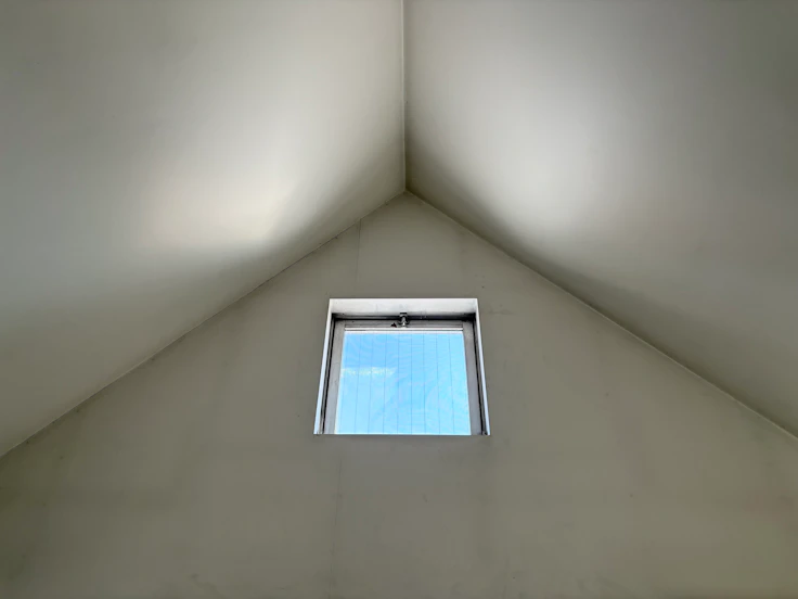 最上階は、白に彩られた屋根の下に広がる空間だ。階下の「緑の部屋」と同様、壁一面に特徴的な棚が備わっている。竣工当初この部屋は青色に塗られていたが、のちに志郎康の妻の意向で白く塗り替えられたという。現在は自然光の映える明るい空間だが、かつての青い壁面がつくり出していた光景は、いまとはまったく異なる様子であったに違いない。壁の一部には、塗りきれなかった下地の青がわずかに残されている。