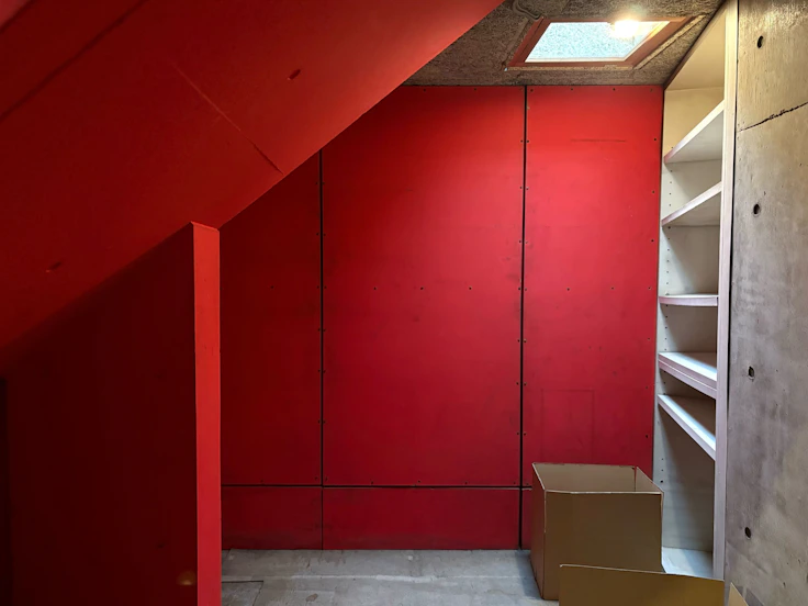 同じフロアには、「赤の部屋」と呼ばれる小さい部屋がある。ここは漫画部屋として使われており、交流のあったつげ義春(1937〜)の作品をはじめ、壁一面が漫画で埋め尽くされていたという。篠原の建築は、広い部屋には白を使い、一部の狭い部屋には鮮やかな色が用いられているが、これほど多くの色を大胆に使っている作品はこの住宅くらいだという。