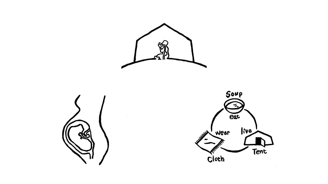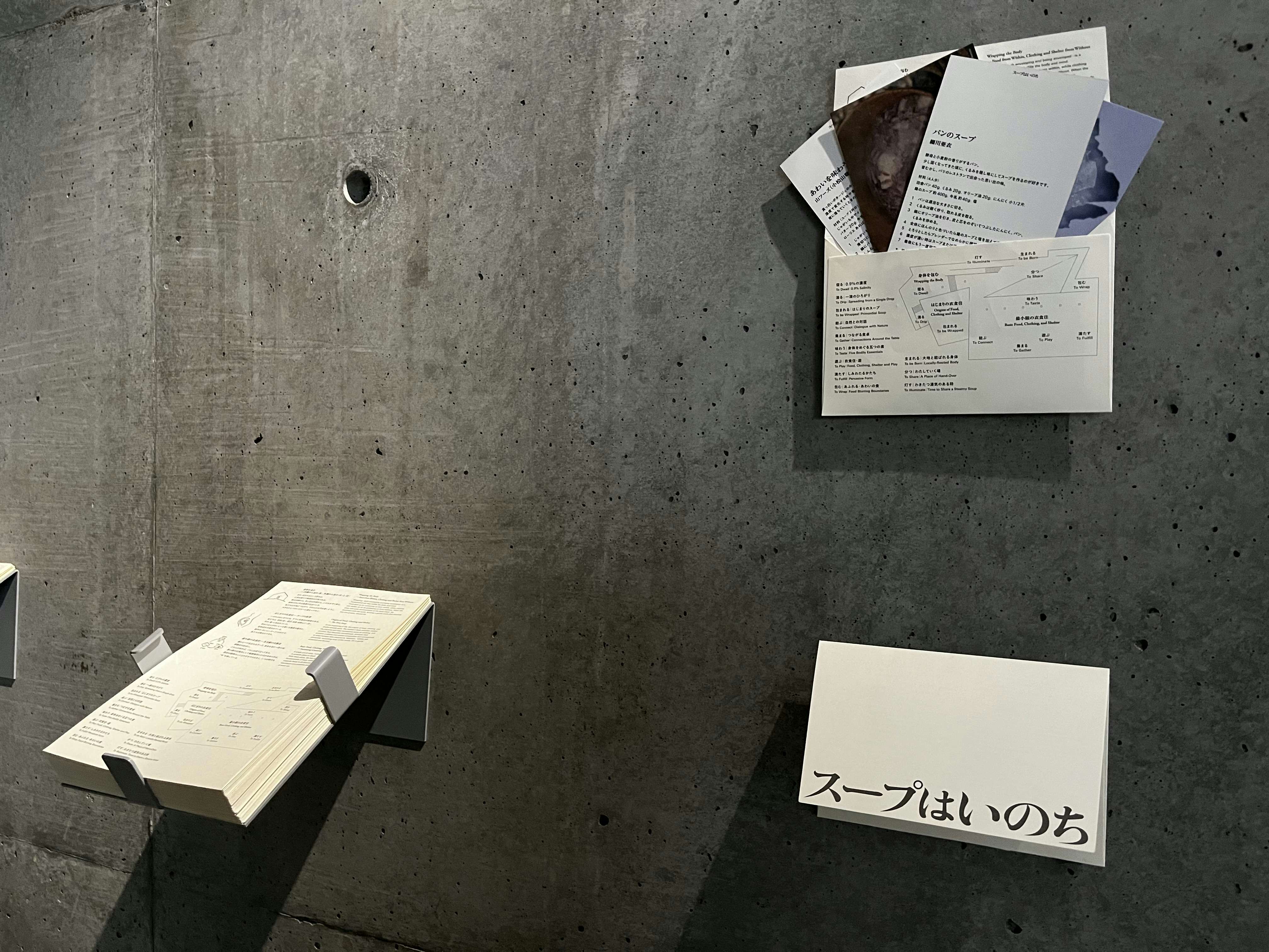 以来、長年にわたりスープについて思考を巡らせてきた遠山は、それを料理としてのみならず、衣服や住まいといった「身体の外側の環境」と、食という「内側の環境」を、地続きの「身体を包む行為」として捉えるようになった。本展は、実体験から立ち上がったそのユニークな着眼点のもと、現代社会における衣食住を支える、原初的な感覚へと立ち返る試みとなっている。