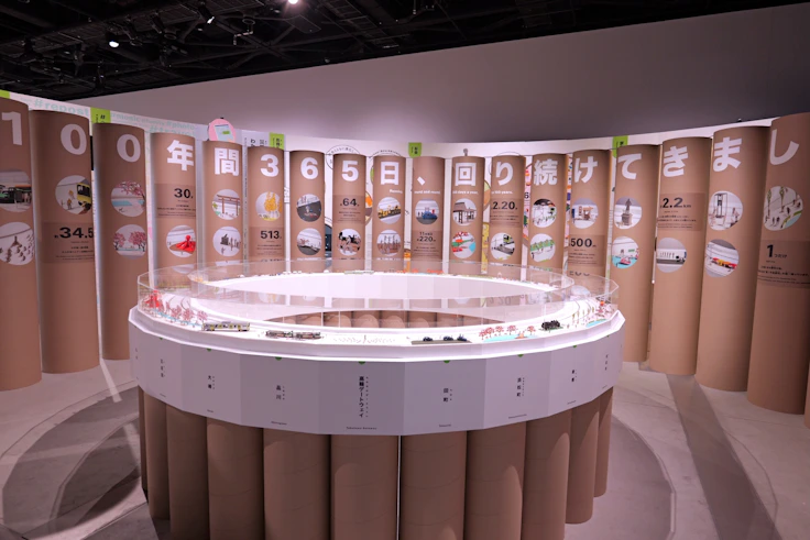 第3章「Zone 3|City:ぐるぐる動くまちと暮らし」では、社会や生活を支える目に見えない「ぐるぐる」にスポットを当てる。テラダモケイ、TASKO、Gakki Lab.のコラボレーションによる、100分の1の紙の山手線が走り抜ける精緻なテラダモケイによる模型作品《山手線》や、慶應義塾大学環境情報学部脇田玲研究室による、18世紀から現代に至る世界の航路を可視化したデータビジュアライゼーション作品などが並ぶ。また、掃除や洗濯といった日々繰り返される「ぐるぐる家事図鑑」の展示など、身近な日常を再発見する展示も興味深い。
