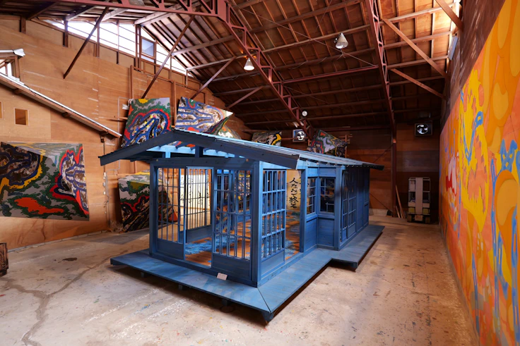 本館最奥の展示室の中央には、青い木製の小屋状の作品《青い基地》を展示。内部には武内が多用する手形と、武内の母がよく語ったという「人並みの努力なら 人なみで終る」という言葉が書かれた掛け軸が飾られている。本作は2004年の個展「宇宙と人間の霊媒師―武内光仁の世界―展」(池田20世紀美術館、静岡)で展示されたものだが、個展をプライベートで訪れた当時の東京都知事・石原慎太郎が気に入り、同年に都庁のホールで2ヶ月にわたり特別展示をしたという異例の経緯を持つ。