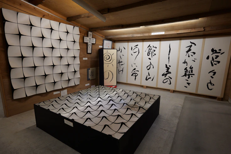 いくつもの鳥居が連なる渡り廊下《父母の門》を抜けると、武内の作家活動50年を記念して制作された《すてた50年、ひろわれた50年、生かされた50年》が展示されている。原色で彩られた波形の門をくぐると、鏡を用いた屏風と祭壇のような小上がりがつくられており、そこに置かれた三方の上には亀の甲羅が載せられ祀られている。