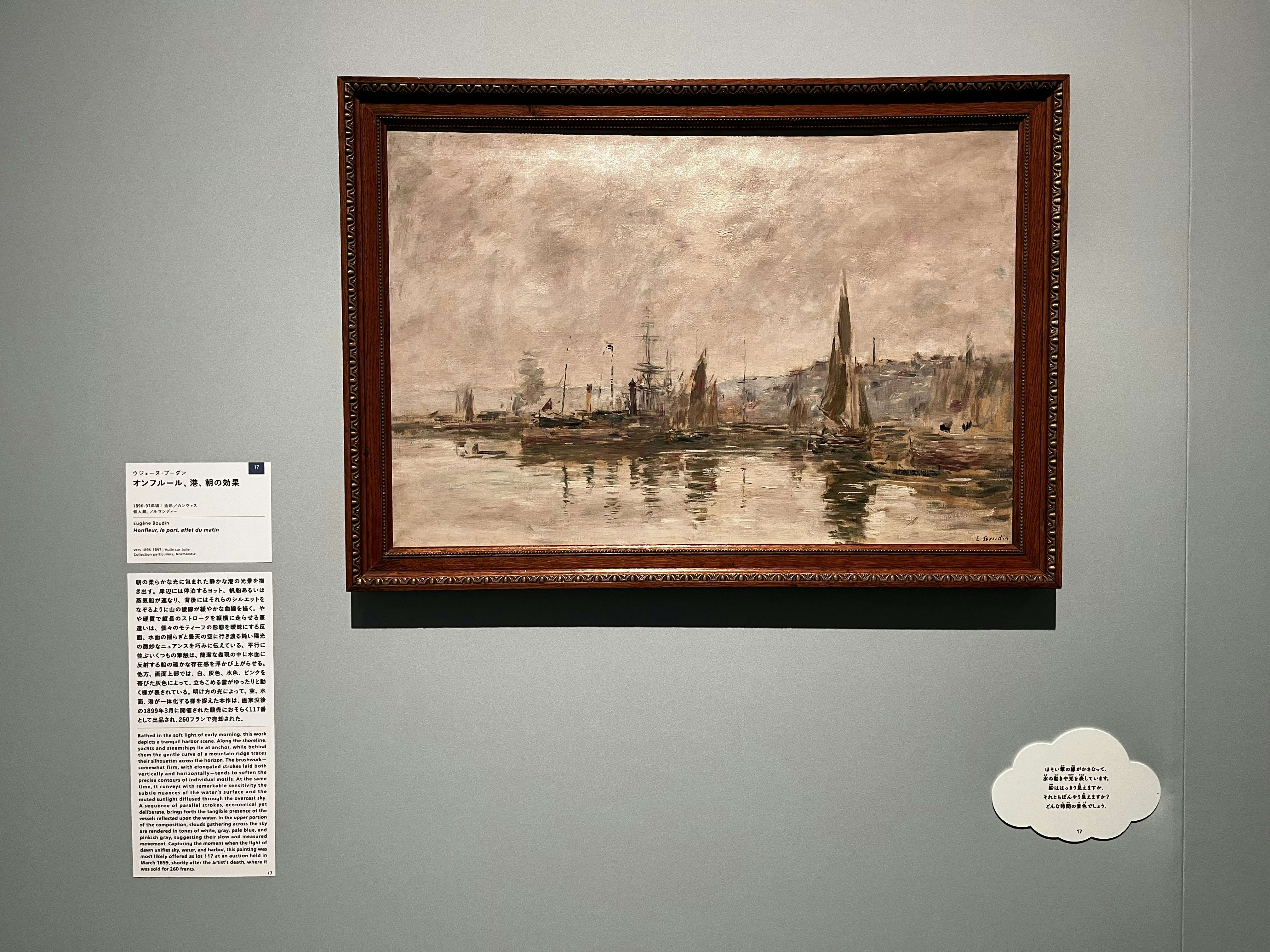 本展は、日本におけるブーダンの展覧会としてはおよそ30年ぶりの開催となる。担当学芸員の岡坂は本展について次のように語った。「印象派誕生から150年を迎えた昨今、改めて19世紀における印象派の役割が見直されつつある。本展はその流れを汲んで企画されたものであり、全114点のブーダン作品を8つの切り口から紹介することで、『海景画家』に留まらない、ブーダンの多面的な魅力を体感できる機会となるだろう」。