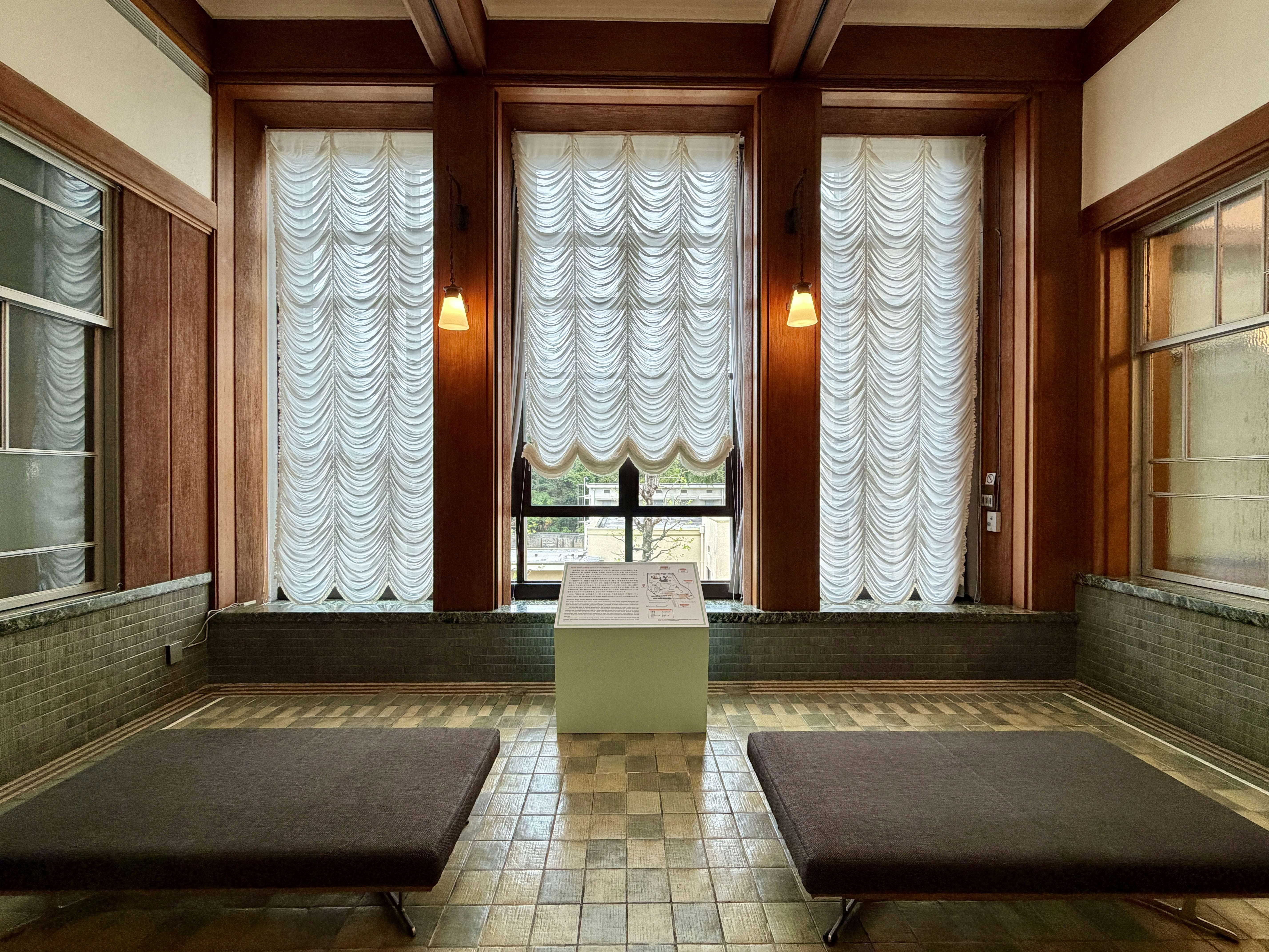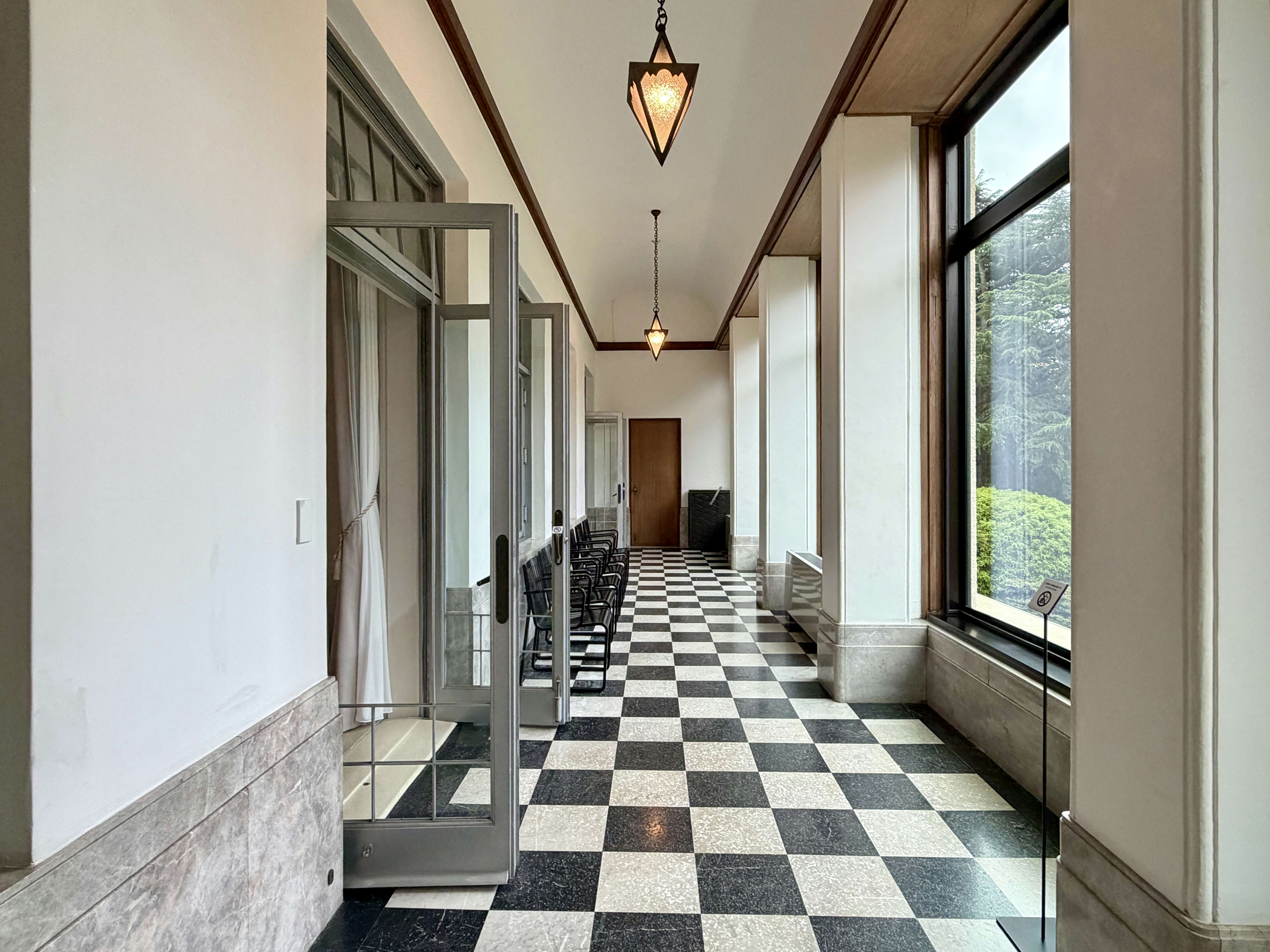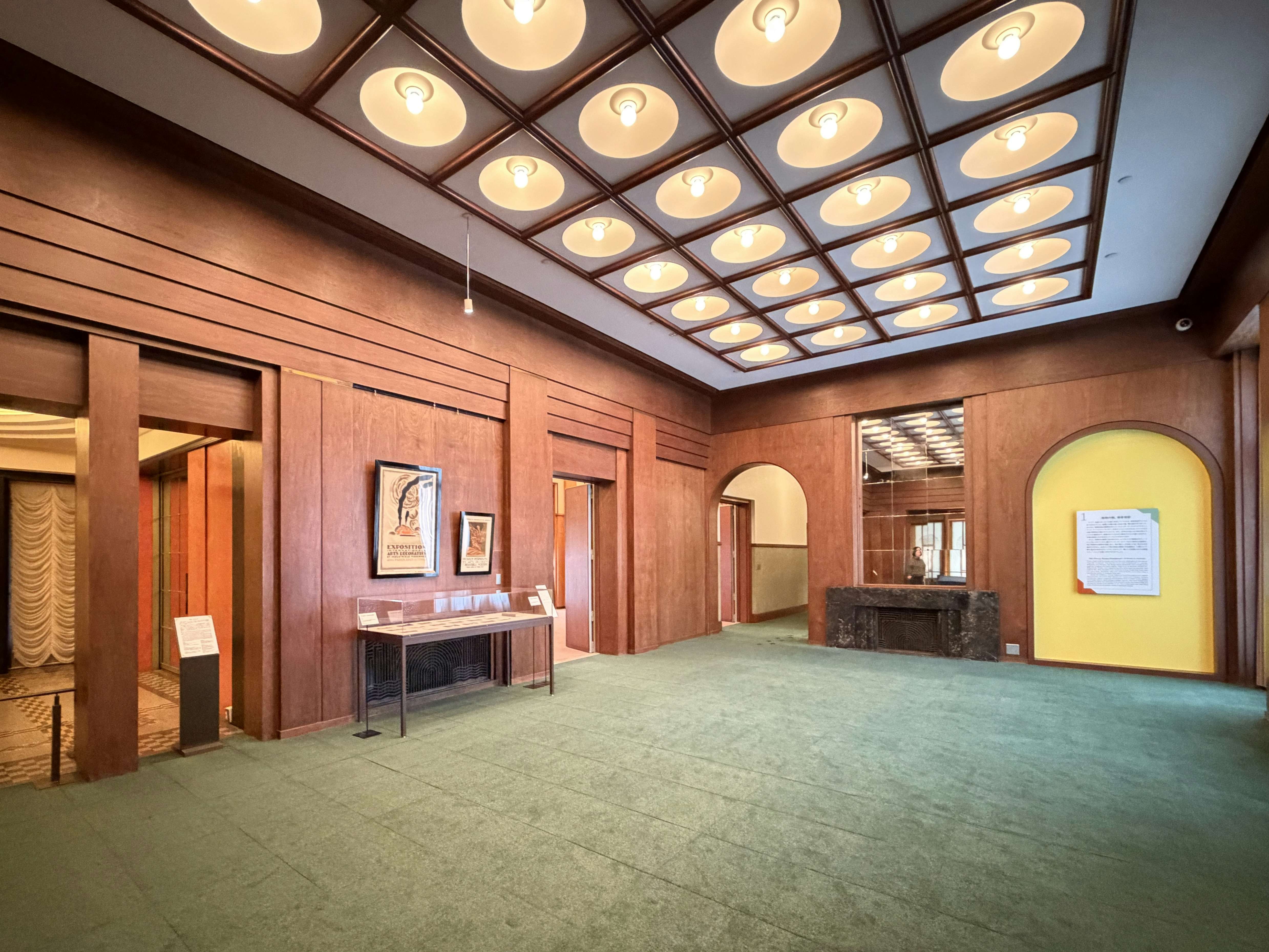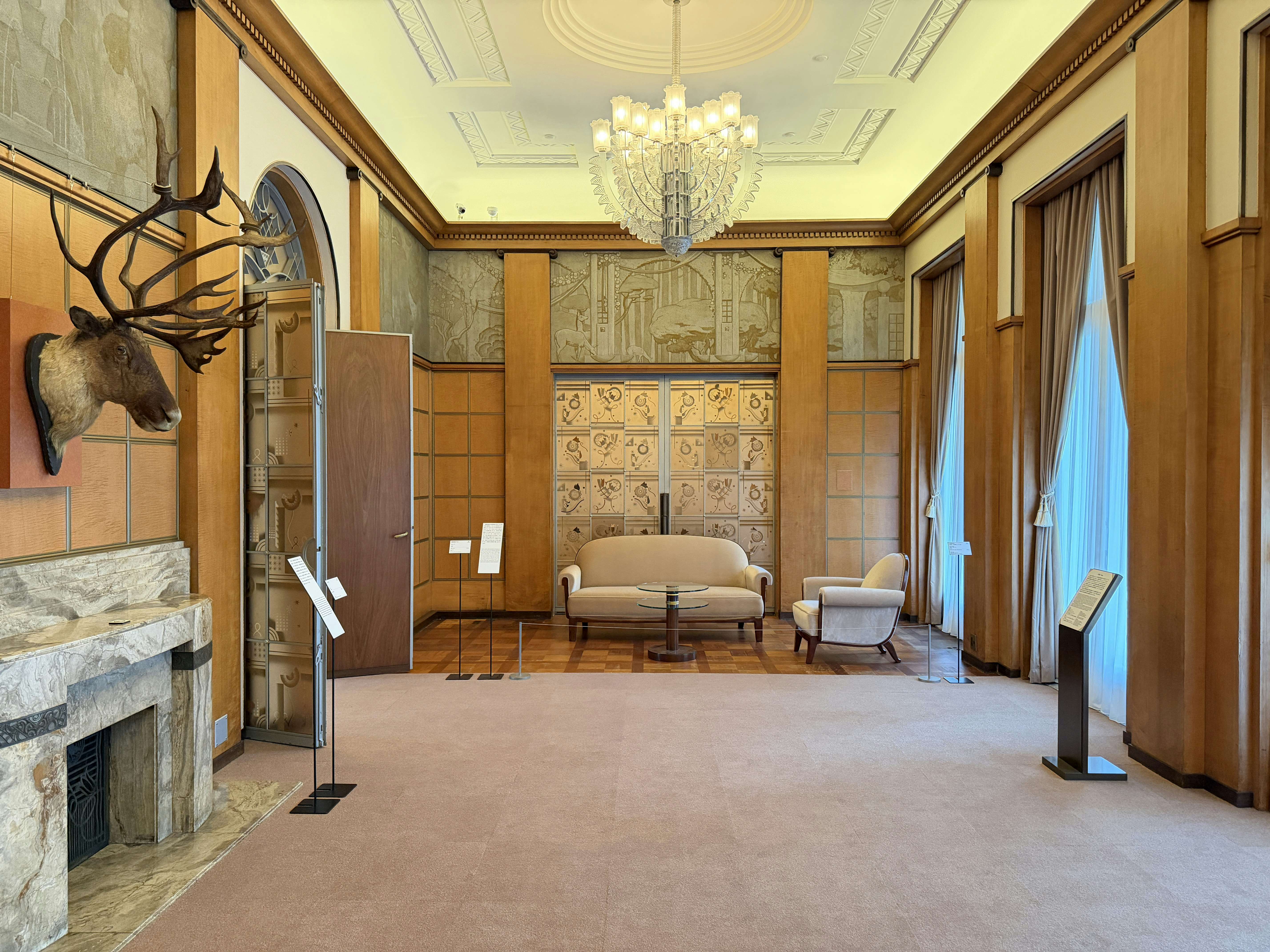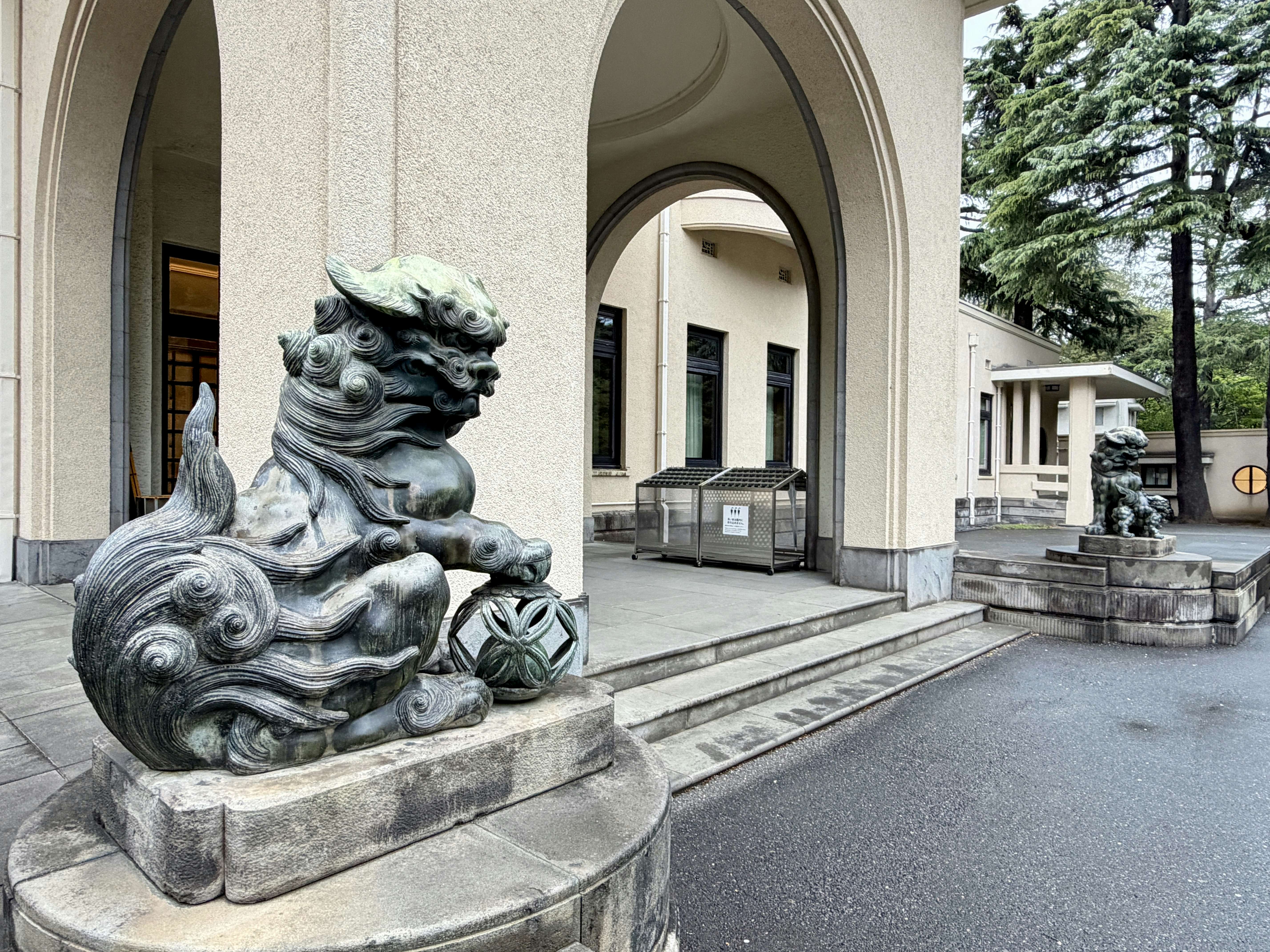 まず来館者を迎えるのは、玄関に鎮座する鉛青銅の唐獅子だ。この一対の唐獅子は、朝香宮家が高輪南町御用邸(現在のグランドプリンスホテル高輪周辺)に住んでいた頃から所有していたもので、朝香宮夫妻が店先で気に入り購入したものだという。白金台へと引っ越す際に、いまの位置に設置された。
