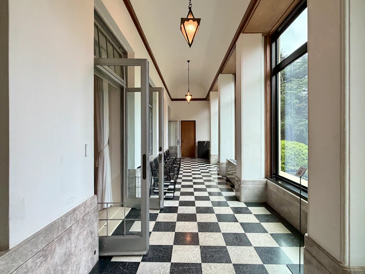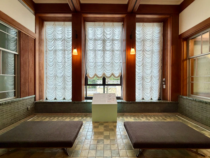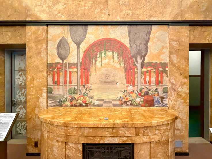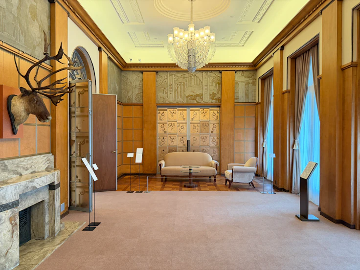 続く大客室では、壁面装飾パネルに注目したい。これは朝香宮邸の室内装飾の責任者だったアンリ・ラパン(1873〜1939)によるもので、木々が生い茂る空間にアーチ状の建造物、そして噴水の水を飲む鹿たちの姿が描かれており、牧歌的な雰囲気を醸し出す。