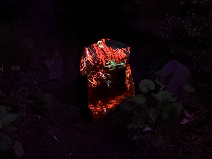《呼応する養老渓谷と森》(2026)は、夜の森を光と音で構成した作品だ。人や生物が通るたびに、その色や音が変化する仕組みになっている。チームラボは自然の造形をそのまま作品として扱うため、自然物に直接手を加えることはせず、光と音を用いてその知覚を変化させていく。他者の動きに反応して空間が変化する本作では、他者とその場を共有しながらともに作品をつくり上げる感覚をもたらす。