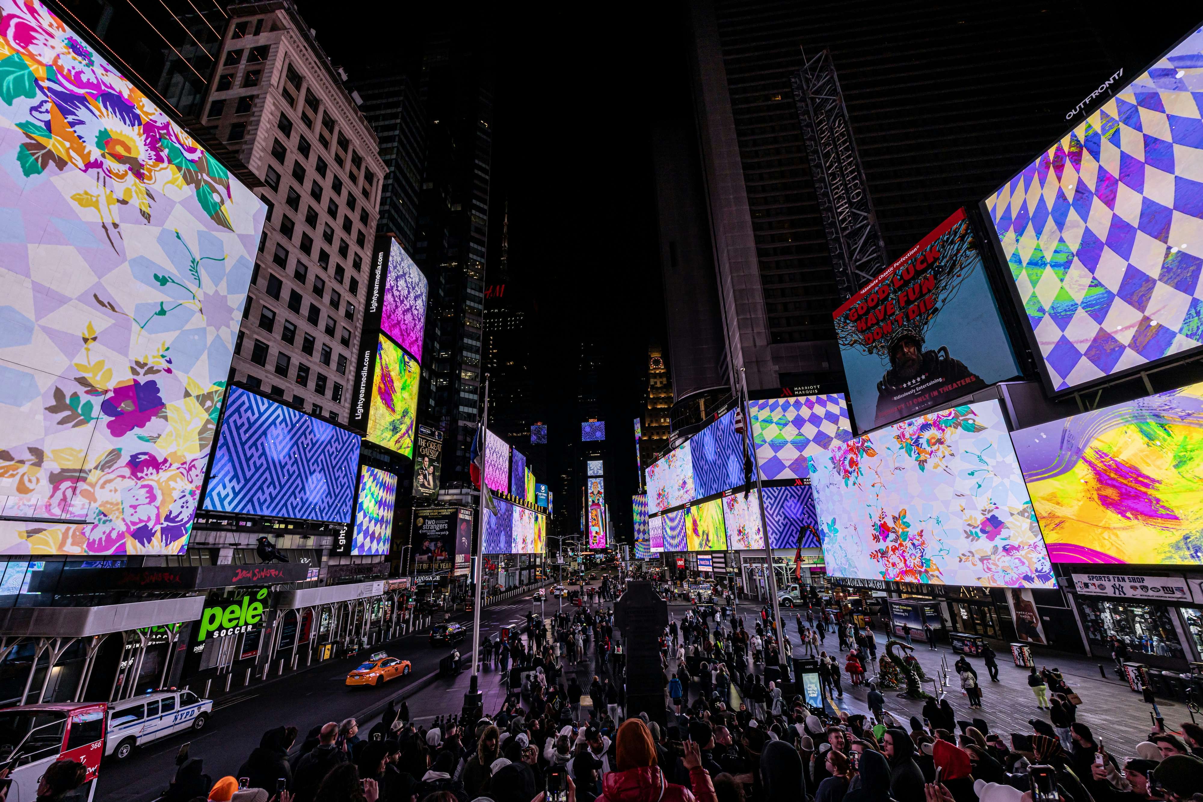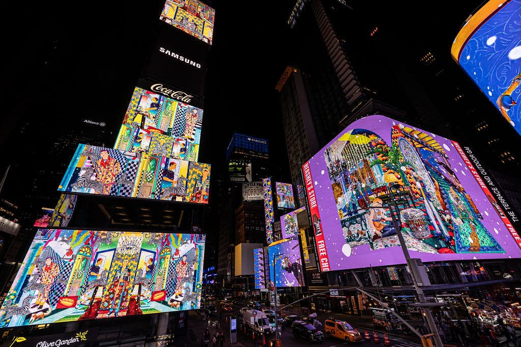 ニューヨーク・タイムズスクエアにおいて、広告の光が一斉に消える深夜のわずか3分間。その瞬間、アートが公共空間を占有する。現代美術家・松山智一は、この象徴的な時間と場所において、最新映像作品《Morning Again》(2026)を発表した。