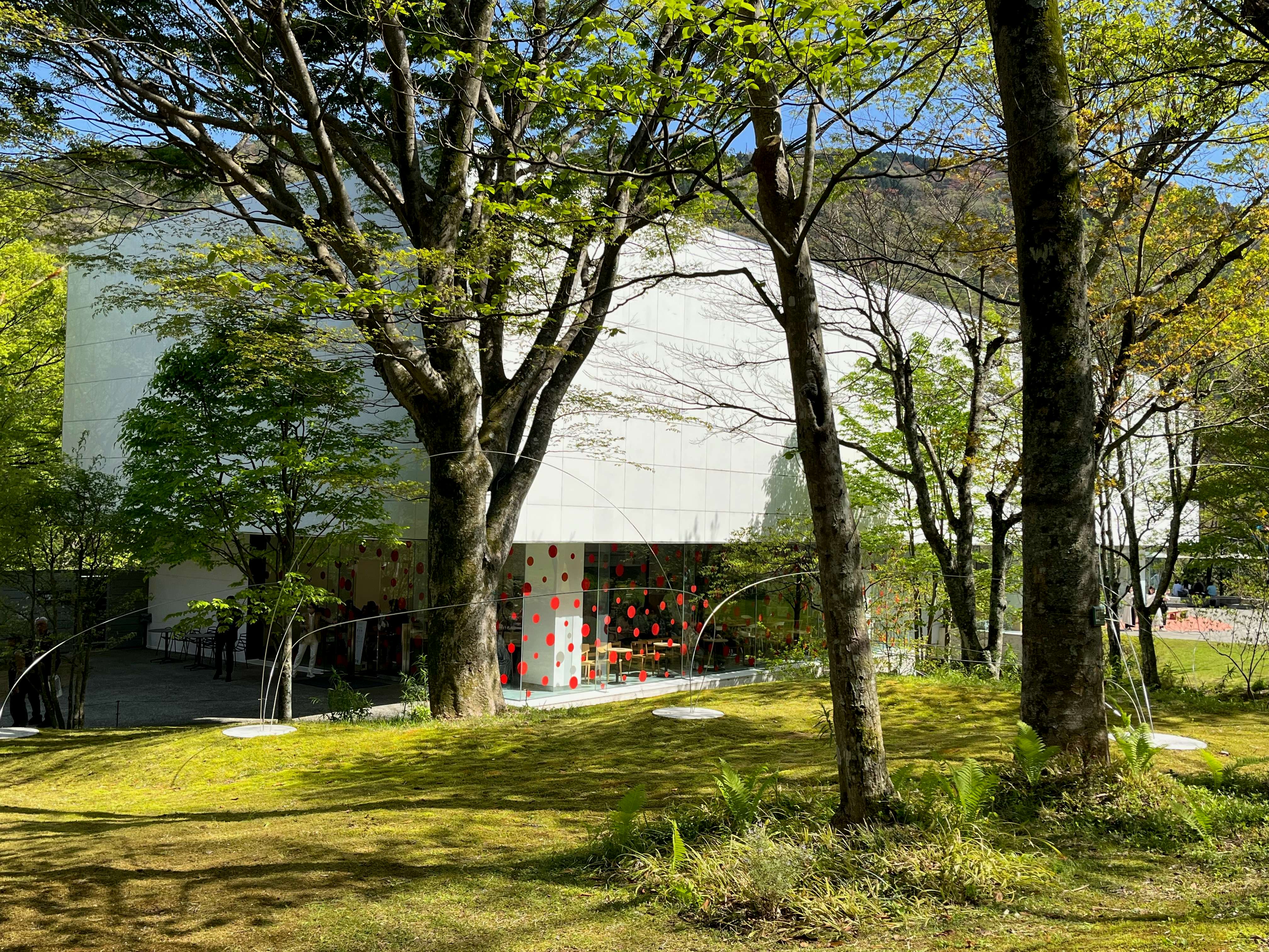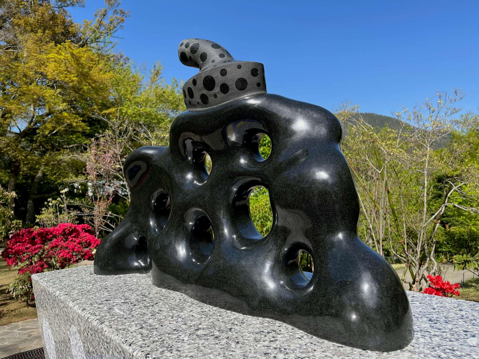 《われは南瓜》は「丸の内ストリートギャラリー」で2025年まで展示されていたもの。展示場所は彫刻の森美術館の奥にある「The Haknoe Open-Air Museum Café」の隣で、作品の周囲には新たにカラフルなモザイクタイルを敷設。石本来の自然な形状を活かしながら車いすなどに配慮した、360度から作品を鑑賞できる空間が完成した。
