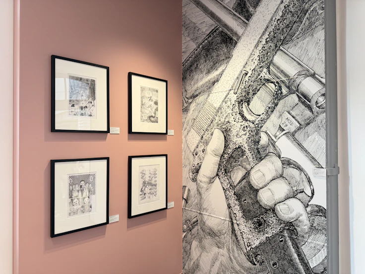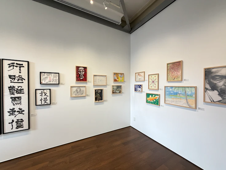 花輪和は、自身の受刑体験をもとにした著書『刑務所の中』と、その後に描いた『刑務所の前』の原画が並ぶ。