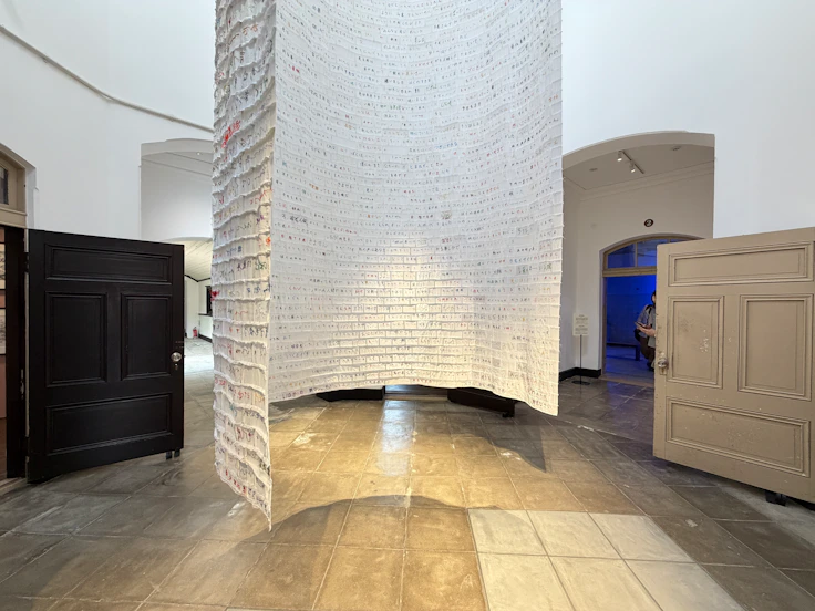 西尾美也は、受刑者たちが残した詩を200人を超える参加者とともに、巨大な布に刺繍として施した。様々な色で縫われた膨大な言葉は、天から降り注ぐように吹き抜け空間に展示されている。