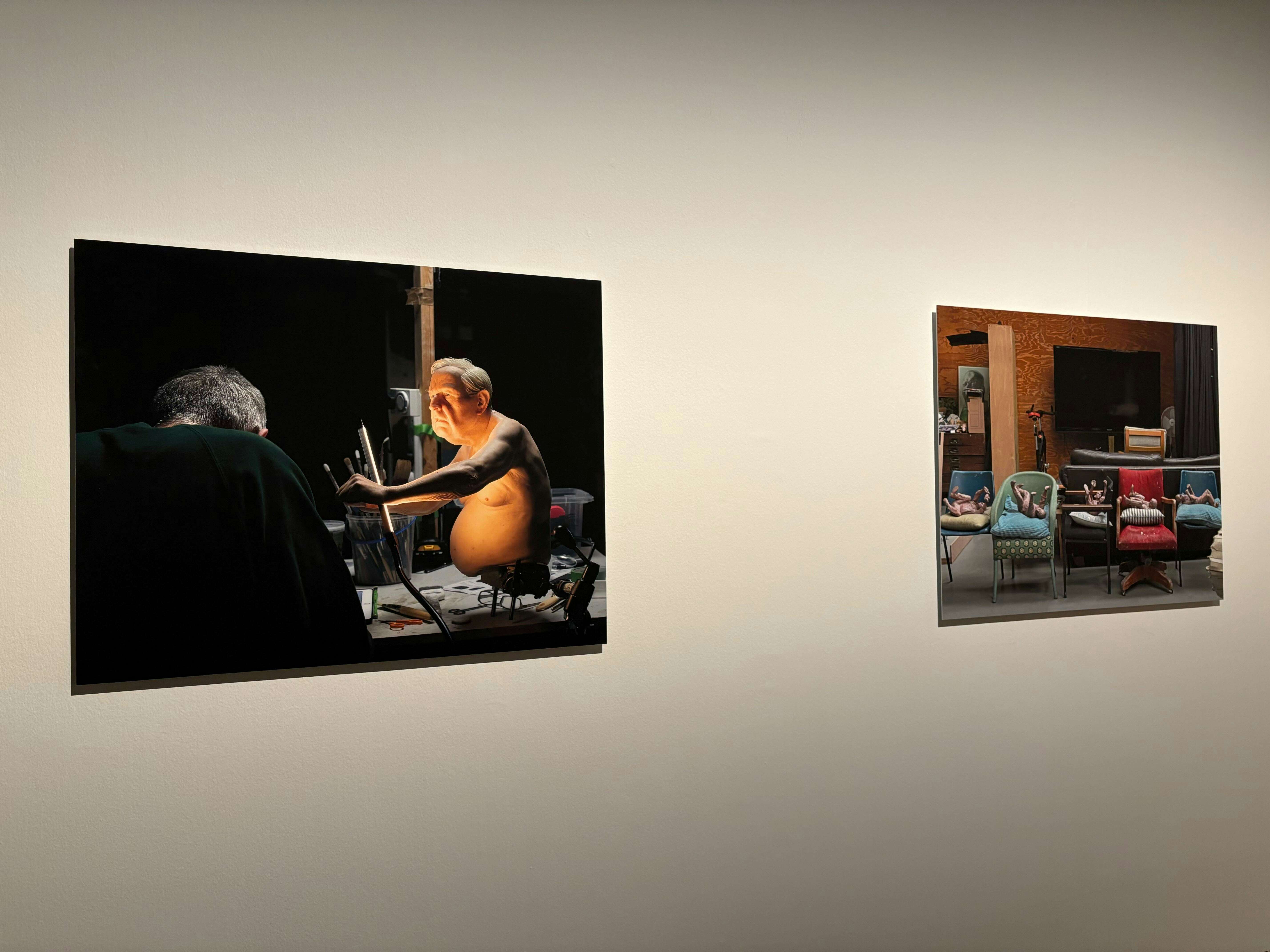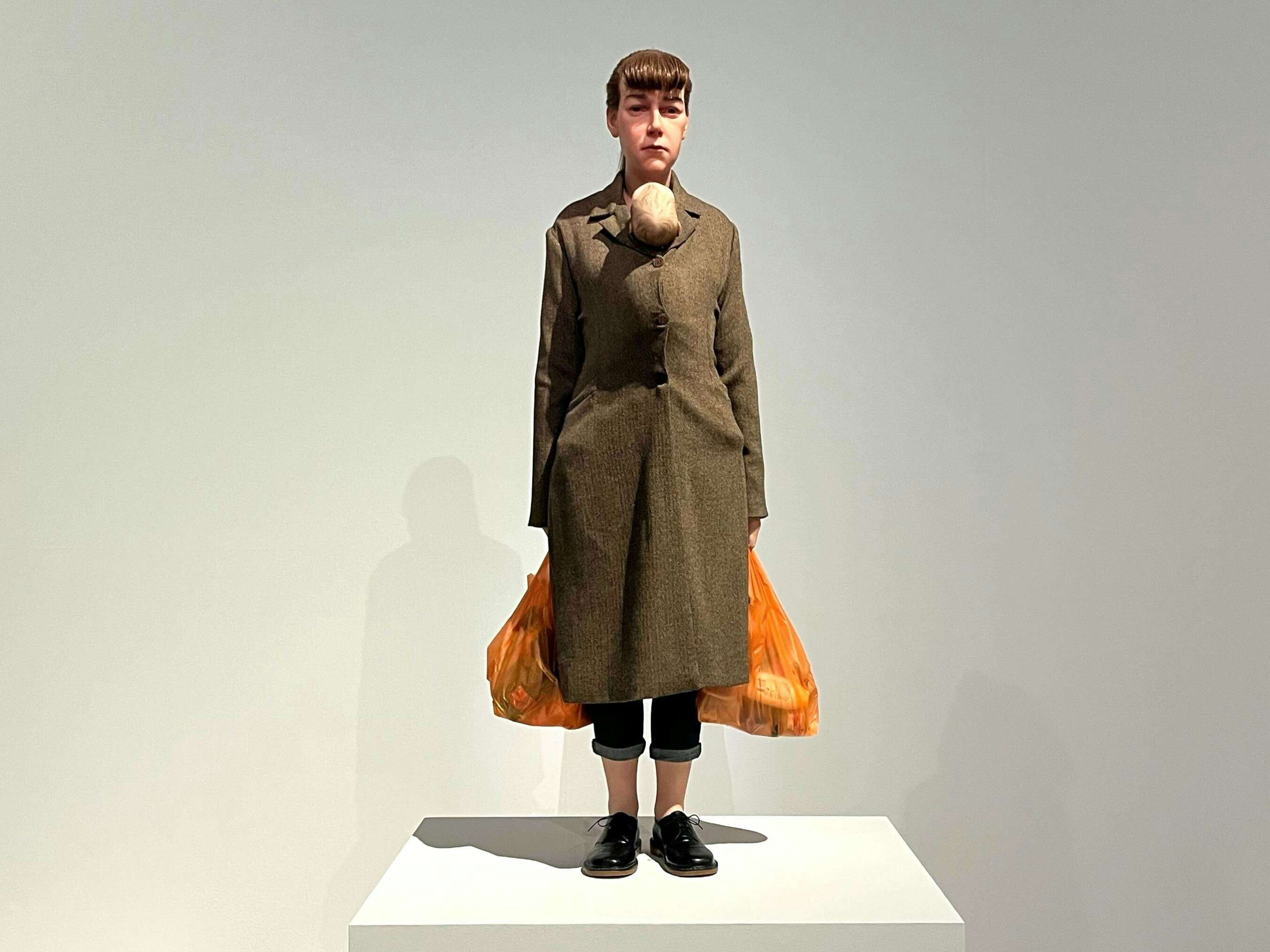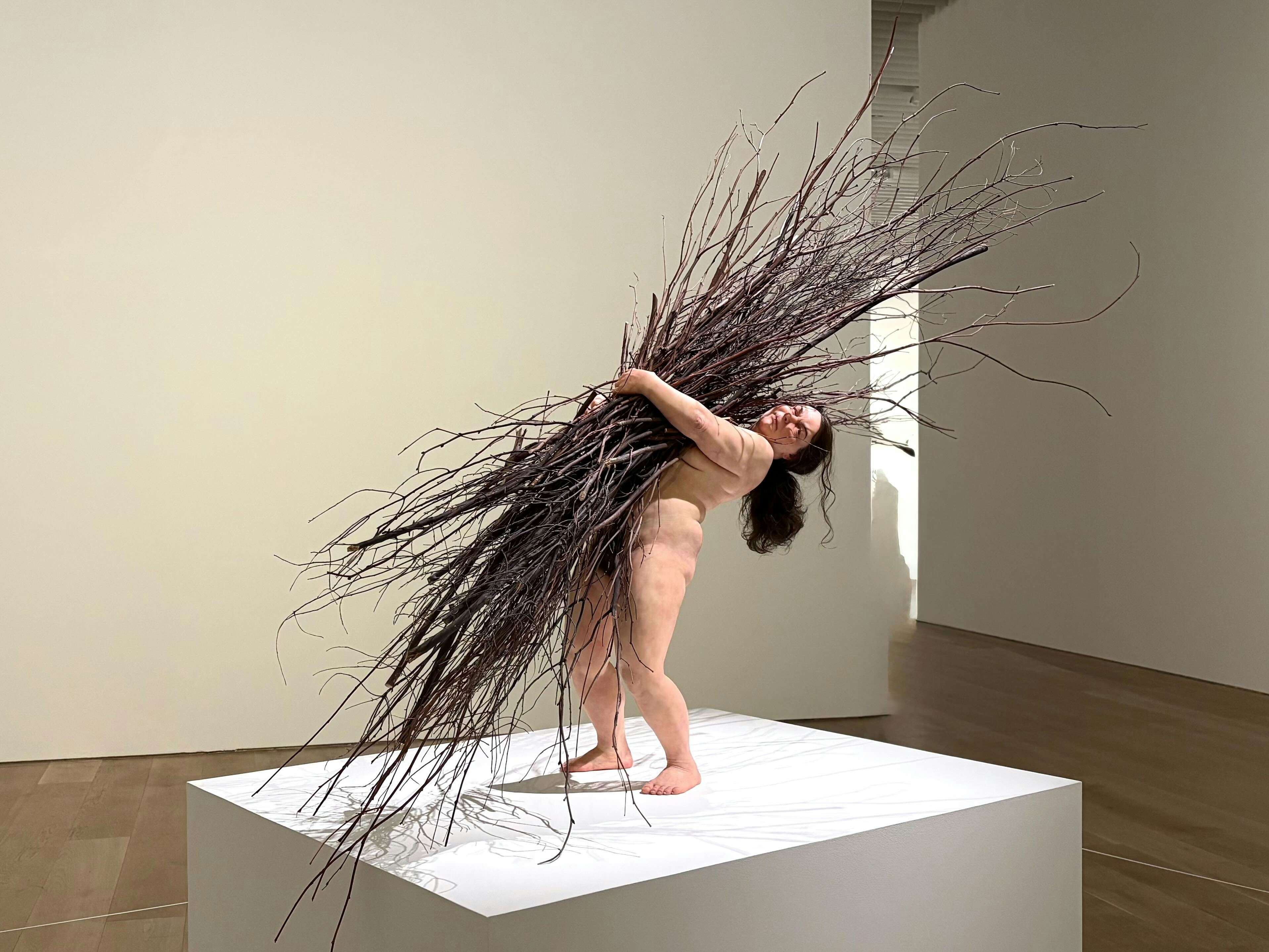 本展は、日本初公開作品のひとつ、《杖を持つ女》(2009)からはじまる。裸の女性が自身よりも大きい木の枝の束をなんとか抱えようと持ち上げている姿が印象的だ。皮膚の質感などはリアルないっぽう、なぜ裸なのか、どのようなシチュエーションなのか、その背景は明かされない。自身の言葉でほとんど作品について語らず、鑑賞者の想像に委ねるミュエクの創作姿勢が伝わってくる。