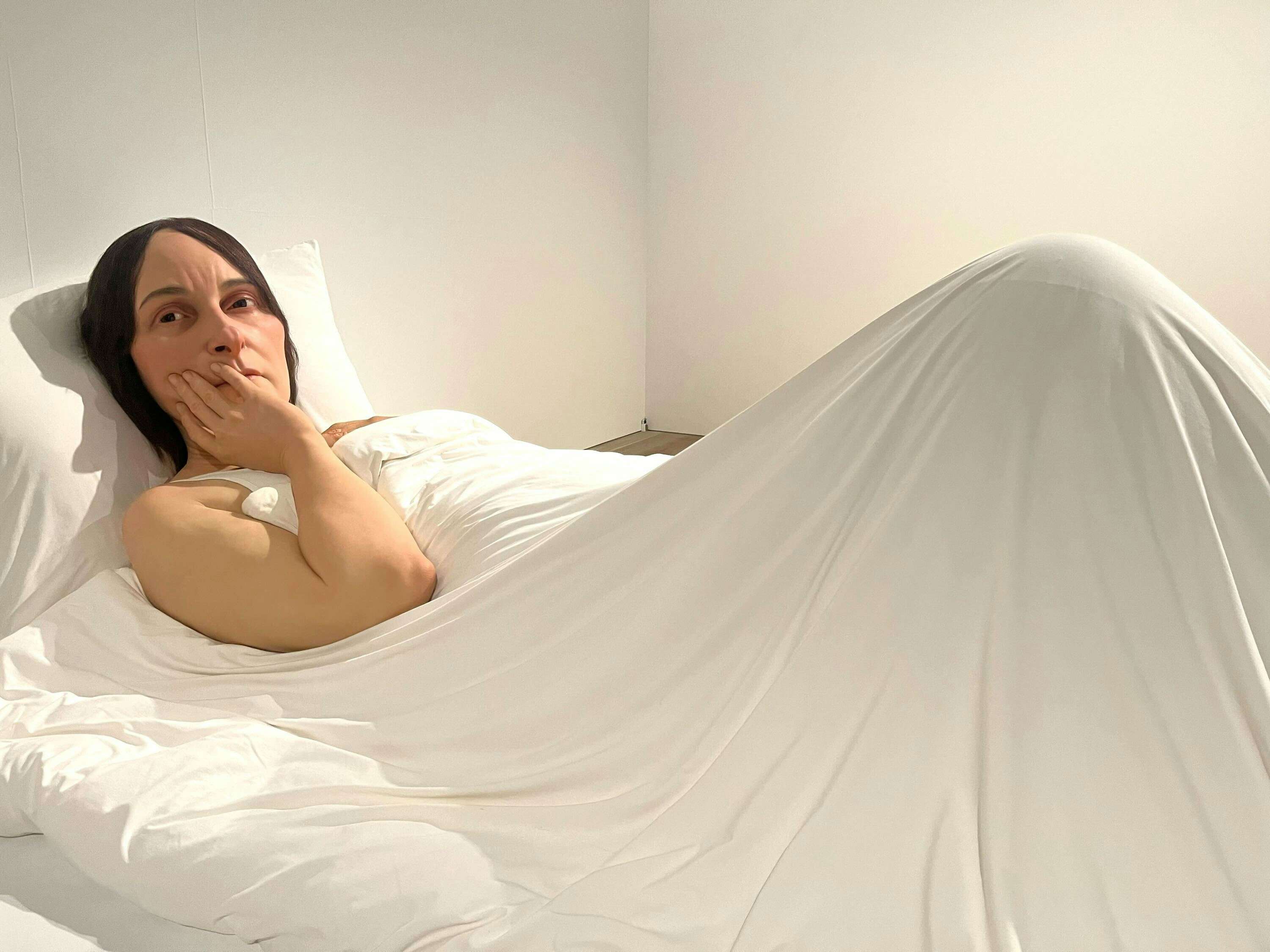 続く展示室では、巨大な女性がベッドに横たわっている《イン・ベッド》(2005)を展示。長さ6.5メートル、幅約4メートルの大型作品だ。日常の一コマのようでありながら、そのスケールゆえに鑑賞する人間が小さくなり、おとぎ話の世界に迷い込んだような感覚に陥る。また、彼女の物憂げな視線は、その思惑を様々に想像する余地を生んでいる。