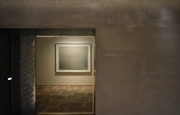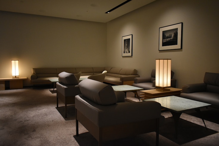 扉をくぐると、杉本の代表作の一つである《海景》が展示されている。足元に目を向けると、そこはかつて京都の市電で使われていた敷石が。真新しい空間に、数十年前の素材が自然となじむ。メインルームには新素材研究所のシグネチャー的な意匠である縦桟障子によって、柔らかな自然光を取り入れる工夫がなされた。また、壁面には杉本の「アーキテクチャー」シリーズが展示され、杉本が設計した空間で、杉本作品を、まるで自宅にいるような感覚で楽しむことができる。なお、ソファーやテーブルなどの家具も、今回のための特注品だという。