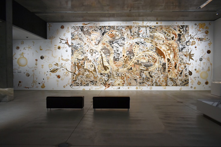 その土地の土や、自然素材を使い「泥絵」を描く淺井裕介は、これまで各地で採取した土に東京ミッドタウン内の土を加え、昨年ヴァンジ彫刻庭園美術館(静岡)で発表した泥絵具による作品を再構成。6日間かけて描いたという作品は壁一面に広がり、躍動感豊かな生き物たちと出会うことができる。