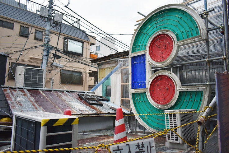 もともとは2棟の家が増改築され続けてきたと考えられているキタコレビル。ここを拠点にしてきたChim↑Pomは、なぜ敷地の中に道をつくろうと思ったのか? Chim↑Pomリーダーの卯城竜太はこう語る。「結成当時から僕たちは道で作品をつくってきた。キタコレビルはウチらの制作場所でもあるから、路上を出現させるのは筋が通ってるかなと。ていうか、スクラップ&ビルドといっても、そもそも何を新しくビルドするか、何が建築的に皆に必要とされているかも、今はわかりづらい。それだったら、スクラップされたものによる埋め立て地として、また実験的な公共空間として、『道』をつくることはどうだろうと。これまでChim↑Pomは公共空間にアタックしてきた側だったけど、逆にChim↑Pomが受け入れ側として、そのアタックをどれだけ許容できるかの実験にもなる」。