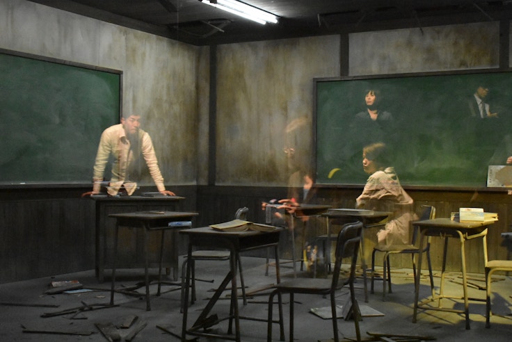 本展のために制作された《教室》。荒廃した教室に鑑賞者が亡霊のように浮かぶ
