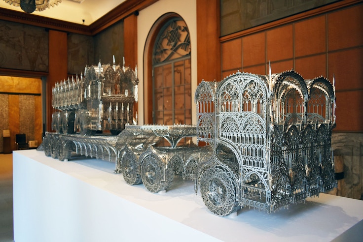 いっぽうのデルヴォワは、装飾を時代や国を超えて多くの人々が理解できる「イメージ」として再構築し、自らの作品に取り込む。1階の大広間では、スーツケース「リモワ」をイスラム紋様で覆い尽くした作品《リモワ・クラシックフライト・マルチウィール 971.73.00.4》(2015)などを展示。機能と、過剰なまでの装飾という、相反する要素が共存する作品を提示する。同じように、労働の象徴であるトレーラーはゴシック装飾で、タイヤはヨーロッパ中世の紋様によって侵食され、本来の役割から解き放たれている。