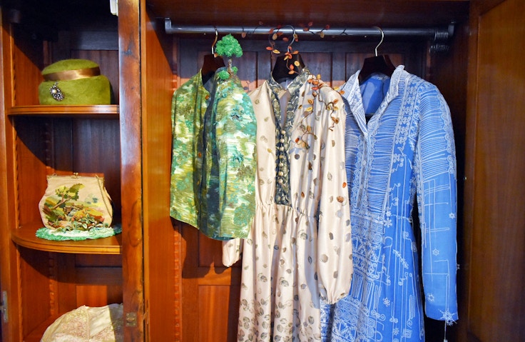 山縣は、本展で最新コレクションを中心に、これまでの代表作を含む13点を展示。階段を上がり、2階広間でまず目に飛び込んでくる《神々のファッションショー》(2017)は、ファッションの起源は神々が動物に向けて行ったショーであるという物語をベースに、2010年春夏コレクションから5体を再制作したもの。また北側ベランダに並ぶ、ぬいぐるみや造花などを過剰なまでに縫い付けた《七福神》(2012)など、そもそもファッションとは何か、装飾とは何なのかを強烈に問いかける作品が、刺激的な空間を生み出している。