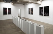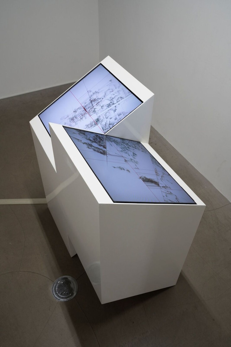 展示のなかで唯一、音を響かせているのが小部屋にある《oscillating continuum》だ。黒川はこの作品のモニター、スピーカー、映像、音の全体を「彫刻」と称しているのだろう。約1mの高さの本体の上部に2面のモニターが並べられ、1面は手前に、もう1面は奥に向かって傾いている。モニターの中央に赤い横線が引かれ、2面のモニターの線がつながっている。この線を軸に微細な点と直線からなる図像が流動する。流動は数秒ごとにノイズと点滅によって区切られ、別の動きに置き換わる。