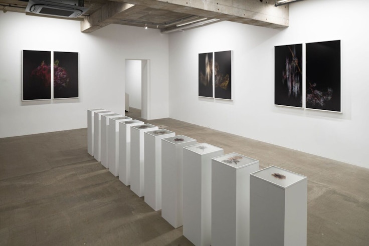 展示室中央に並ぶ台に、押し花とデジタルプリントを組み合わせた「elementum」シリーズが平置きされている。にごった鏡面に押し花が乗り、それを微細な点と直線からなるプリントが覆う。初めは、むらのある網目状の褐色のプリントがベージュの押し花を包んでいるように見える。だが、クモの糸やカビを思わせるこの網目は、眼を凝らすと、別の平面にある幾何学的図像であることがわかる。視線は2つの平面のあいだにあるなんらかの規則を探ろうとして緊張する。押し花と鏡面に落ちる図像の影が2つの平面の見え方を複雑にしている。