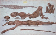 戦後の阿部は変容を速めていく。戦争責任追及と軍国主義への反省が叫ばれる、一億総懺悔の空気のなか、彼はいち早く培った英語力を活用しGHQ将校と親交を深めるいっぽうで、運動の先達であったはずの福沢一郎を、阿部らは戦争画を描いたという咎で糾弾し、美術文化協会から追放している。自分は軍属であったのにもかかわらず、である。さらには戦場で目撃した記憶であろうか、補給を断たれ飢えや乾きに苦しむ兵士たちを克明に描いた、いわゆる反戦画まで描いているのだが、画面からはある種の空疎さを感じてしまうのは私だけだろうか。