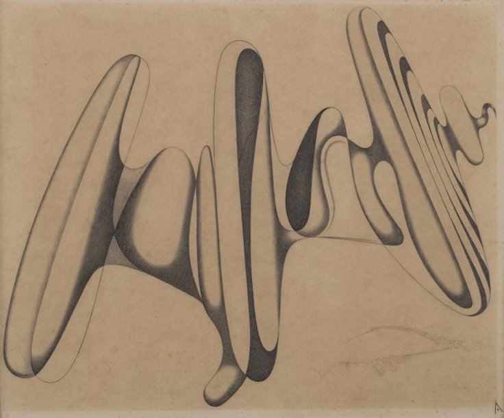 本展のサブタイトルには「あくなき越境者」とある。1913年新潟県に生まれた阿部の仕事を、時系列順に追った回顧展であるが、現代の学生には馴染みがなく、観賞には忍耐を要求されるかもしれない。しかし、戦後日本の前衛(懐かしい響き)の展開に重要な存在であり続けた彼を顧みる機会は、これからも訪れるにちがいない。世界中を渡り歩き、生涯を通して激しいスタイルの変遷をみせた前衛画家の“越境”とはいったい。