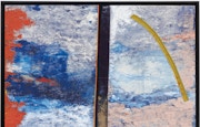 ベンヤミンを踏まえて(?)ルビーのコラージュは、グラフィックと絵画の両極を同時に遂行(非レイヤー的なものをレイヤー化、またその逆)しようとするものである。前回のシリーズ「BC(ひとつの読みとして「ブリーチ」「コラージュ」)」では、支持体の布を脱色することで布自体からイメージを出現させ、ベンヤミンの言う非レイヤー的絵画に応答するとともに、その上に布や段ボールやテープによるコラージュを施すことでレイヤーを措定していた。本展ではブリーチの代わりに、意外なほど因習的な抽象画が描かれているが、基本は同じである。ただし出品作のタイトル「VERT(ical=垂直)」「WI(n)D(o)W=窓」「CR(o)SS=十字架」が垂直性を示唆していることから、今回の両極は、水平性と垂直性へとずらされているようだ。「垂直」については、バーネット・ニューマンの細長く屹立する立体作品「Here」が参照されているかもしれない。それはカラーフィールド(=レイヤー)の重なり合いで構成された絵画を垂直に切り裂く「ジップ」が、2次元の外の次元に属することの文字通りの表現である。それとは反対に、ルビー作品ではその細長いジップ(しかも汚れた段ボール)が、画面中央に垂直方向にコラージュされてレイヤーを発生させるのである。段ボールと画面はしばしば補色関係に置かれているので、レイヤーはなお一層はっきりと浮かび上がる。