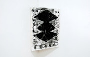 2つの展示室のうち、大きな窓を持つ開放的な部屋での周囲の環境までも取り込む立体的な作品空間が印象に残った。壁面を覆うように設置された土を下地とした大きなキャンバスに、濃密に描かれた平面作品は水平に広がり、ステンレスの薄い板を切り出したオブジェクトは垂直に立ち上げられ、それらふたつが相互に応答するよう構成されている。少し引いた位置から俯瞰すると、水平と垂直という差異はあるが同じような輪郭を持つ2つの作品は、無限大の記号や砂時計を思わせる形態を持ち、自ずと時間という尺度が想起される。黒いキャンバスの上に横たわる砂時計のような形態は永遠に終わらない時間を、そして遠近感の強い濃密な描きこみは宇宙の広がりを連想させる。赤瀬川原平は《宇宙の缶詰》において缶詰の内と外を反転させることで無限の宇宙をその内側に梱包することに成功したが、鈴木は中央に一本の線を残すことで宇宙が決して閉じないことを暗示する。