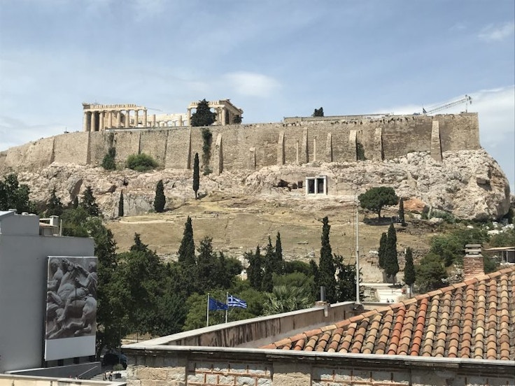 はじめて訪れたアクロポリス(高い丘)は、たしかに小高い丘の上にあった。アテネの街が360度眼下に広がり、遠くには地中海が青く光る。丘全体が天然の岩場で緑は極端に少なく、斜面を上がるごとに太陽との距離が近づく。5月だというのに太陽と岩の間に挟まれて、焼けるように暑い。くらくらしながら見上げたパルテノン神殿は、想像をはるかに超える巨大さで、天空に向かって垂直に立っていた。