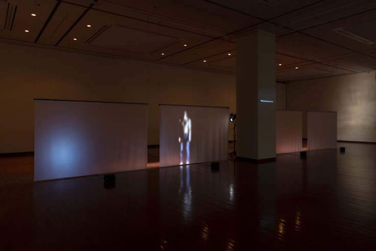 来館者が最初に訪れるのはおそらく、展示空間の片隅にある、非常口へと通じるドアの片面に、プロジェクション・マッピングで映し出された、contact Gonzo(以下、ゴンゾ)の塚原悠也だろう。ピナ・バウシュなどが得意とした、偶発的な接触を起点としたダンスを日本人の身体にカスタマイズしたダンサーが、「このドアは、開けちゃいけないので、開けないでください」と語りかけてくる。奇妙に淡白な調子で。平面の映像となったゴンゾが、わたしたちのからだを誘い、そして拒むのだ。相矛盾するフレーズは周到に仕組まれている。