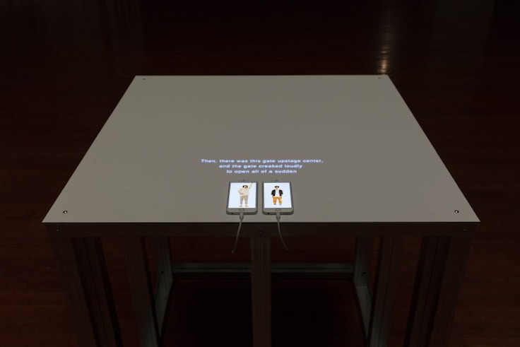 急いで付け加えておけば、カーテンとみなしたほうがいいスクリーンは、立体物としてそこにある。そこには、天井から、そして裏側のフロアにも、ほのかな橙色の光のライトが設置されていて、外側から映像の内側へと淡い光の影を這わせている。4つのカーテンの前にはそれぞれ小さなスピーカーも置かれていて、おのおの調整された音は立体的なサウンドスケープをつくりあげている。映像となった役者たちは、カーテンに映し出された映像の平面から、接触を求める言葉と、接触を諦める言葉を発しかけてくるわけだ。世界は、平面のなかに押し込められ、圧縮されたかのようだ。世界は、平面からはみ出し、膨張していくようだ。