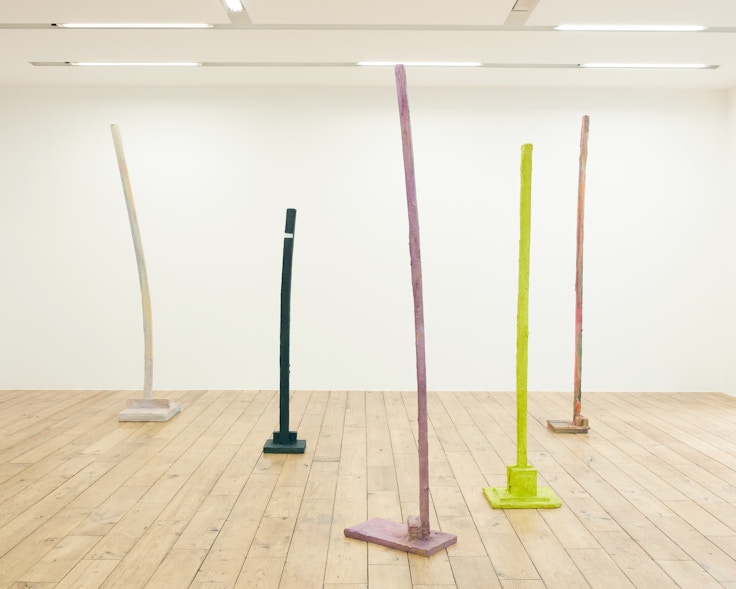 「スタッド」の屹立した佇まいとぼかされた色合いは、ポップな印象を醸しながら、しかしジュール・オリツキーの前ミニマリズム的なモダニズムの立体表現にも近い。見る角度によっては垂直性を感じさせつつも反り返った木材の形状は、「上昇」という意味を持ちながら、同時に「limus(斜め、曲がり)」を語義に含むラテン語の「sublimis」によってもっとも的確に形容されうるだろう。上に向かいつつ傾斜によって基軸から逸れていく、運動と視覚の内発的な敵対性。この「sublimis」が、モダニズムの鍵概念でもある「崇高(sublime)」の語源とされていることを考えれば、ハリソンはそこでモダニズムにひそむ歪みをありのままに表現しているようにさえ思える。