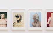 「ハウス・オブ・ザ・ドルフィンズ」。さしあたり「イルカたちの住処」とでも訳しうる本展は、アメリカ出身のアーティスト、レイチェル・ハリソンの日本での初個展である。階段を下りて地下のギャラリー・スペースに至ると、点々と配された7点のカラフルな柱状の立体作品と、壁に並ぶ12点の写真作品が目に入る。前者は、製材所で規格外となった木材に、セメント加工とグラフィティ調の彩色を施した「スタッド」と呼ばれるシリーズ。後者は、アテネやデルフィなど、ギリシャ各地の博物館でハリソンが撮影した古代ギリシャ彫刻のイメージであり、被写体の顔や頭部、腕の部分などが欠損している。