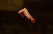 基町アパートのショッピングセンターを舞台に制作された映像作品《さよならシンドローム》は、これまで見てきた適/不適の転回というテーマにおいて、とりわけ重要な位置を占めている。向かい合う2つの映像にそれぞれ映し出される2人の男性(うちひとりは松田)が、男性器を模した玩具をキャッチボールのように投げ合う。どちらもが投げるたび、「いらないよ〜」「いりません」といった言葉を発する。しかも、当人たちは下半身を露わにしつつ、自身の性器を股に挟み、「なくなった」ことにしている。かつての小学生男子には懐かしい(?)、バレバレの非男性化をよそおいながら、いつまでも男性器を投げつけ合い、押しつけ合い、温存させてもいる。