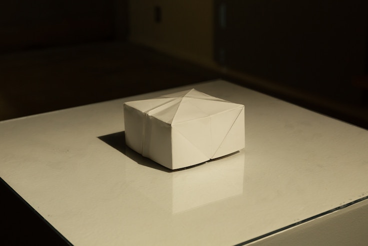 展覧会では、即席麺やカロリーメイトのイメージを反復させ、「不適」な食生活を色鮮やかにあらわした「The pattern」シリーズ3点をはじめ、6点の新作が発表されている。《Box with the Space of its own X-rating No. 1》は、その内部でアダルトビデオが上映されているらしい。だが本作は、誰も内部に入れない手のひらサイズの閉じられた箱状パビリオン(DVDのパッケージ紙を図柄が内となるよう折り畳んでつくられている)である。鑑賞者が目にするのは、「不適」とされるコンテンツを内包した、ということになっているオブジェクト、としての作品である。