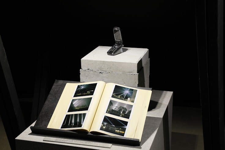 勝手に大規模な展覧会を想像しながらたどり着き、最初に目にしたのは、吹き抜けの広々とした空間に置かれた、人工芝を貼った小さい山のような構造物。展示会場はそれだけだった。古墳のようにも見えるそれは「メディアアートの墓」だという。1ヶ所だけ開いている入口から入ってゆくと、携帯端末、バッジ、ハードディスク、電話などがケースに収めて展示してある。展示品全部まとめてもスーツケースひとつに入れて持ち運べそうなほどしかない。あっけにとられるほど、小さな展覧会だった。