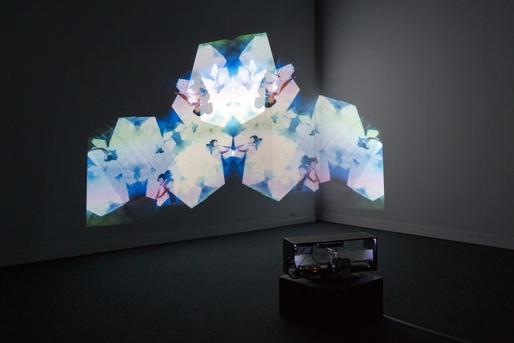 たいして暗室で展開された映像インスタレーション《よびつぎうつし》(2018)は、「1時間で1周するプロジェクターによって、360度の投影が展示室でおこなわれる。映し出されるのは、小金沢によって呼び出された、幽霊たちである」(*6)。たしかにそれは映像の回転機構が露出しており、部屋に展開される――プロジェクターの投影範囲だけでなく、すべての壁が同時に潜在的にスクリーンでありうるという意味で――映像の幽霊を可能にするオペレーションの存在が鑑賞者に開闢されており、奇術的だといえる。それに人物をおぼろげにコラージュした映像もまた不気味で、たしかに「マギカ」である。だが同時に、その音すらしないゆっくりでスムーズな一定速度の自動回転は、影絵や写し絵におけるぎこちない手動のアニメーションの補完、間の悪さ、あるいは即興的に手をかざして光を乱すようなぐだぐだ=しわだらけ(seamfulness)とは異なる、稠密の「卒なさ(seamlessness)」をもっている。