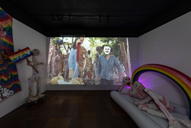 EUKARYOTEでの磯村の個展は逆説的にも「LOVE NOW」と冠されている。展示空間やそこで展示されているものの造形的な洗練はまだまだ向上の余地があるけれど、こと遅延した時間に対する敬意においては、彼の右に出るものはそうそういまい。紙製の副葬品を燃やすことで死者を供養する習俗に倣い、磯村は同性者同士のための婚姻届を燃やす。日本在住のネパールの料理人たちとの会話を通して(一人は日本語の辞書を読んでいる)、犬を祝福する祭「ククルティハール」を実践する。