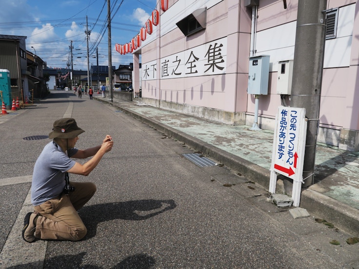 会場に並んでいるのは、じつに多様な物や情報である。「つくりものの世界」「作品の登場」「都市とモニュメント」「ヌードとはだか」「戦争の記憶」といった章立てを目にしただけで、これまでの著作で取り上げられてきた、様々な創作物や活動、風習が一堂に会していることがわかるのだが、それらが一次史料、複製、再現(つくりものの再構成)、記録、解説といった、多様なレベルの情報を介して紹介されている。さらには、『ハリボテの町』(朝日新聞社、1995)の表紙でお馴染みの、「この先つくりもん作品があります。」と記された立て看板の実物(!)。これは、福岡町つくりもんまつり(富山県・高岡市)で、なんと現在も用いられているものであるという。