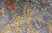 同じことは、フォトデッサンと同じく型紙をつかったエアコンプレッサーによる吹き付けの絵画や、彼が晩年に取り組んだ抽象絵画にもいえるだろう。エアコンプレッサーによって紙の表面に吹き付けられた絵具の粒子の群れは、型紙によって特定のかたちをなすが、それは次の瞬間ほかの粒子群と混じり合い、新たなイメージの連関をつくり上げていく。そして、ポスト印象派のスーラなどの点描を参照したと言われる瑛九の抽象絵画における点描は、いっぽうでスーラの筆触分割の厳格さを採用せず、個々の点がときに重なりあい、さらには無数の粒子が複数の集合体を形成している。