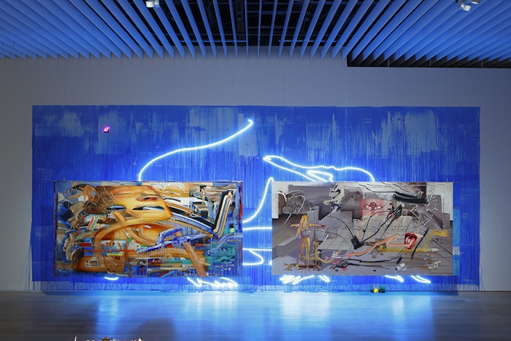 また、今津景《ロングタームメモリー》(2018)の右の絵画には、子宮や真っ赤な唇など女性を表す記号とともに、サルからヒトへの進化を示す図が描かれている。いっぽう、左の絵画の人物の表情は、レディオヘッドの『The Bends』のジャケットと酷似している。CPR(心配蘇生)マネキンの映像からサンプリングしたと言うCDジャケットのデザイナーは「アンドロイドが初めて感情を、しかも快楽と憤怒という両極の感情を同時に発見した表情」と説明する。敷衍するならば、背景となる壁面は、現代のデジタル空間を象徴し、感情を発見したアンドロイドによって、女性を中心とした歴史の再編が進化の系譜上で図られている。しかし、男性中心社会が生み出してきた女性性を象徴する記号がデジタル上にもあふれ、画一的なイメージで女性の進化を語るしかないアイロニーを見出せるだろう。