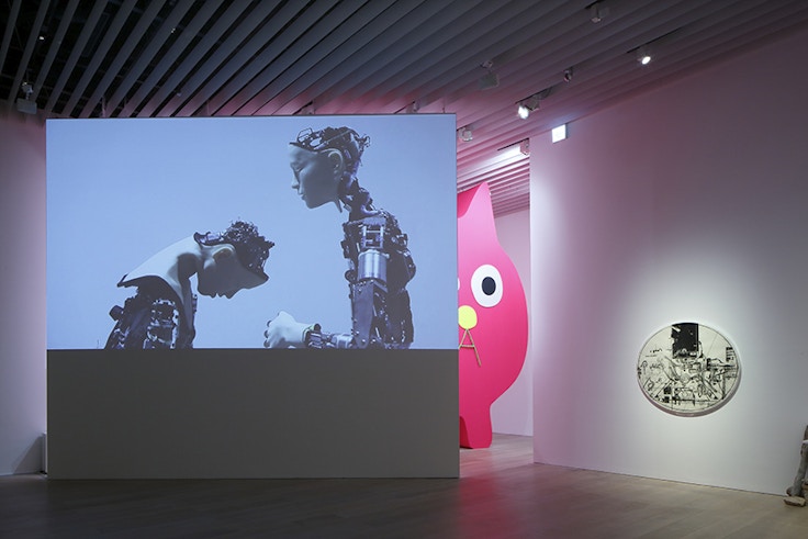 会場風景。左から、土井樹+小川浩平+池上高志+石黒浩×ジュスティーヌ・エマール《機械人間オルタ》(2016〜)より、ジュスティーヌ・エマール《ソウル・シフト》(2018)、飯川雄大《デコレータークラブ―ピンクの猫の小林さん―》(2019)、佃弘樹《Ouroboros》(2018)
