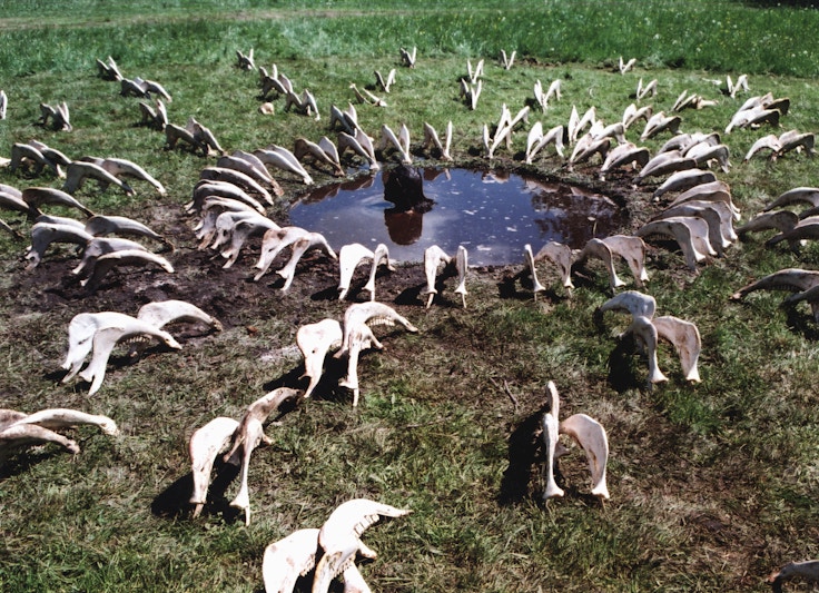 牛の骨が円を囲み、その中心に塩田が顔半分まで泥水に浸かるインスタレーション《私の死はまだ見たことがない》(1997)では、牛の頭蓋骨を肉屋からもらい、夜な夜な肉をこそげ落としたという。獣の肉をはぎ、隠滅した罪は、いくら洗っても落ちないとでもいうように、泥のなかでひとり「死」に見つめられている。これをかたちにできるエネルギーはきっと、塩田自身の身をも滅ぼしかねない力だろう。人間が疎外され、生命が生と死を蠢くように生きることを排除されるクリーンでリジッドな現代のシステムは、ますます強化され続けている。塩田は自己の内部の声を聴くという私的な行為を通じて、この世界のなかで、私たちは何を回復するのか、できるのかを問う。それは、塩田が文字通り身を削っている、その身体と切り離すことができないものだろうと思う。