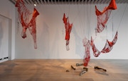 赤い糸がからまりあい空間全体を満たしている。その糸を一身に集めるようにすっと、舟が何艘か床にうち置かれている。舟と舟は交わらないが、そこから伸びる糸は無数につながりあっている。