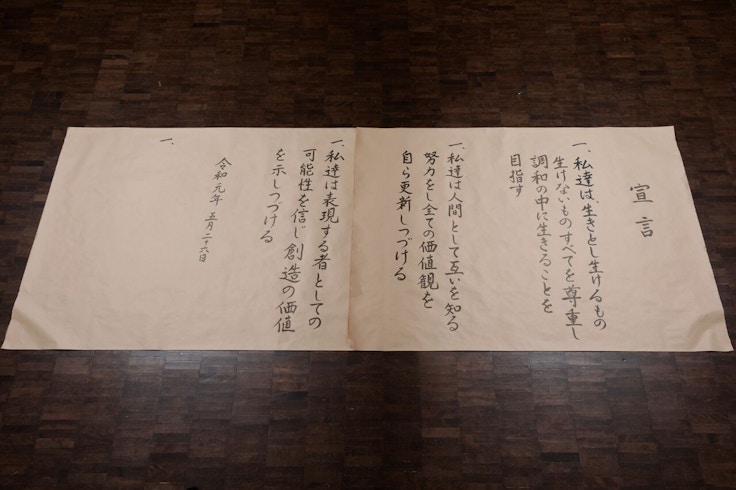 リサーチなどにベースを置くプロジェクトは、しばしば、どのような展示物としてそのプロジェクトをリアライゼーションするかが問題となる。ワークショップの成果として、そこで経験されたプロセスを言葉(宣言文)に凝縮するシンプルな出力は、オリジナルの宣言文に込められた相当のプロセスと熱量の事実に応えようとする態度と見えた。人間世界を越え、自然世界を含み入れた「人新世」の時代の平等性を、その土地に根ざして表現すること。大学移転を前に、彼らは声高に自らのスタンスを表明していた。