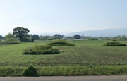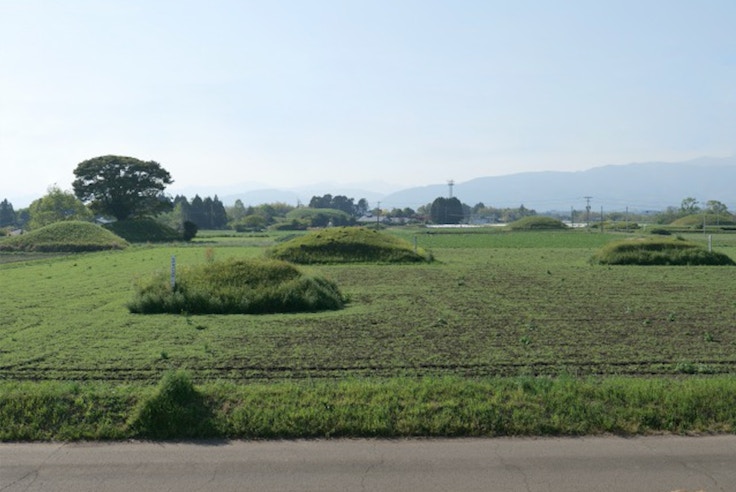 山城大督の個展「パラレル・トラベル」を見るために、宮崎の高鍋町美術館を訪れた。美術館主催の「時と空間を旅する古墳あるき」というイベントに参加したのだが、豪雨の影響で交通網が乱れ、宮崎空港から高鍋の持田古墳群へタクシーで直行することとなった。到着してその光景に驚く。畑の中にぼこぼこと古墳が顔を出している(という表現も妙だが、そんな風に見えた)。仁徳天皇陵として知られる大山(だいせん)古墳などの巨大で威厳のあるイメージとは趣が異なり、複数の小山が茶畑に溶け込んでいるさまは、のどかでほのぼのとしている。そこに突然、垂れ込めた雲の上から飛行機の轟音が聞きえてきた。すぐ近くに航空自衛隊の基地があるのだ。畑の中の古墳群と航空機。高鍋の旅は不思議な体験から始まった。