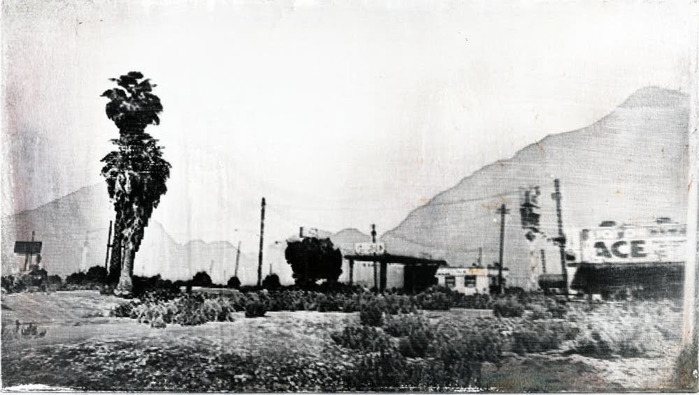 街へと続く砂の上の足跡、椰子の木の高さや葉の広がり、人々でにぎわう建物の並び、それらの位置関係。どこか人工的な構図のもと、中央の空に飛ぶ1羽の鳥が目に映る。