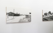 祖師谷大蔵駅から続く、にぎやかな商店街を通り抜け、少し脇道に入った閑静な住宅街の一画、古木の敷かれたギャラリーでモノクロームの風景の前に立つ。木製パネルに塗られた白色の塗料に、黒色の景色が浮かび上がっている。風景画か、風景写真か、と画面のなかを探索する。ローラーの跡と像のにじみが混ざり合うその荒い白と黒は、塗膜の凹凸と相まって、どこか空気遠近法で描かれた絵画のように、後景をやわらげ、かすんでいる。しかし、よく見れば、風景は画素の配列を示すドットマトリクスによって規則正しく、微細に分断されているのである。