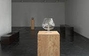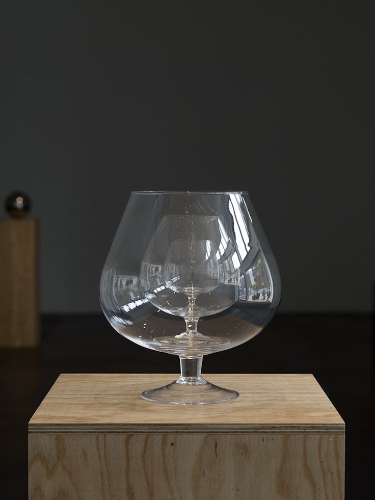そのときあなたは、この展覧会が鑑賞者がいなくとも成立することに気づくかもしれない。金属の球体は眼球=レンズの代替物としてここに置かれ、そしてコニャック・グラスもまた、縮尺の変わる3つのオブジェクトに対応する、3重の眼球=レンズとしてここにある。展示室は鑑賞者ではなく、この2点を中心につくられている。それに気づいたとき、あなたは構築された奥行きに「より一層入り難く」感じ、「reception=歓迎、受け入れ」という皮肉を理解するだろう。あなたが踏み入れたのは、観測者なき思索の世界なのだ。